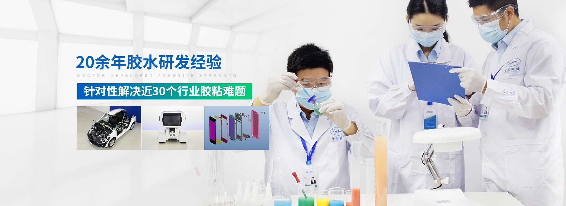 聚力擁有博士帶領的研發團隊在膠水等研發領域深耕20余年,與國家級重點實驗室、華南理工大學、武漢理工大學、浙江大學等學校合作, 榮獲多項發明專利,掌握600多款膠粘劑配方,可針對性解決膠粘難題,提供全面膠粘解決方案。